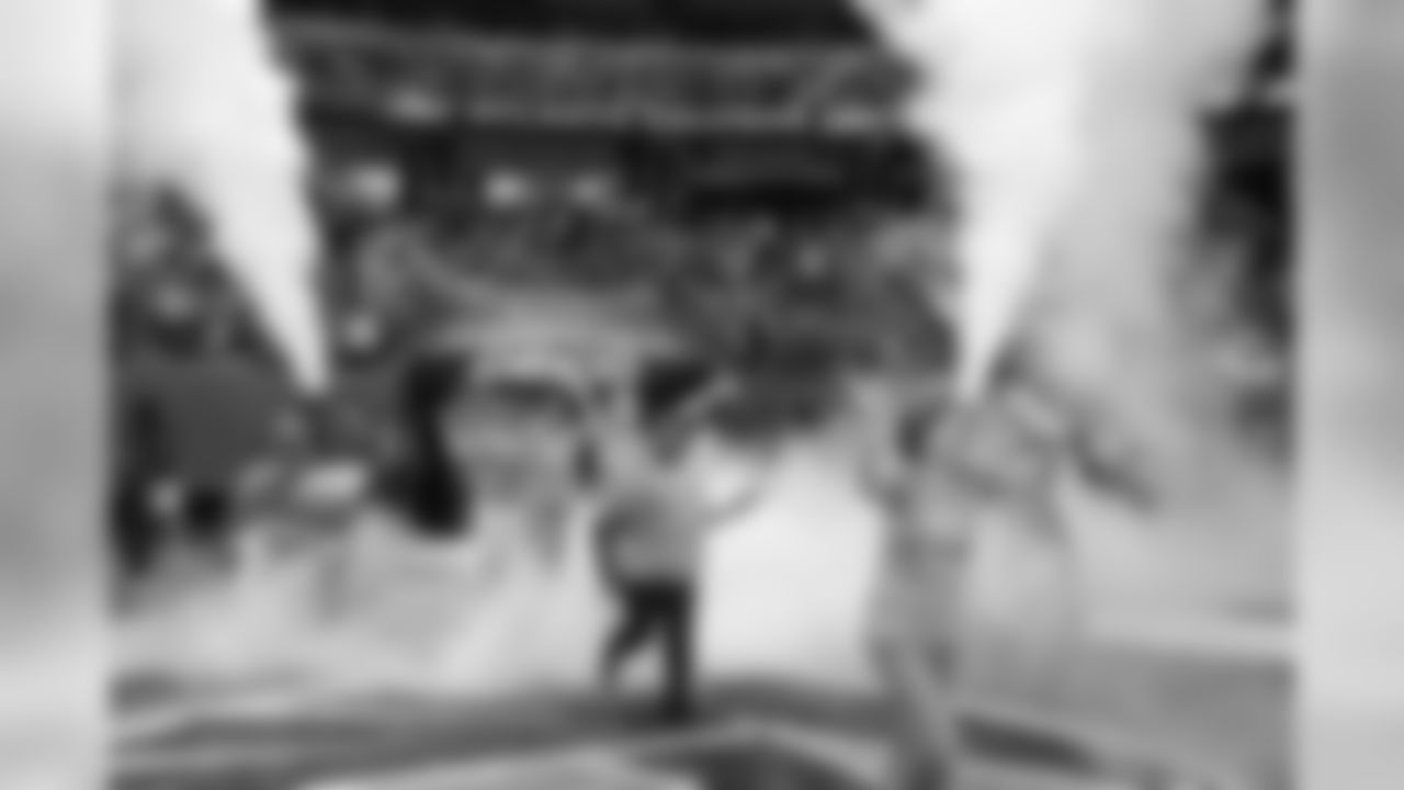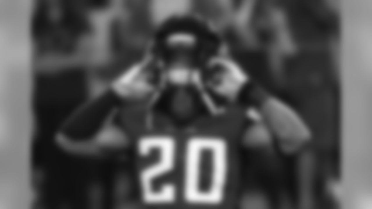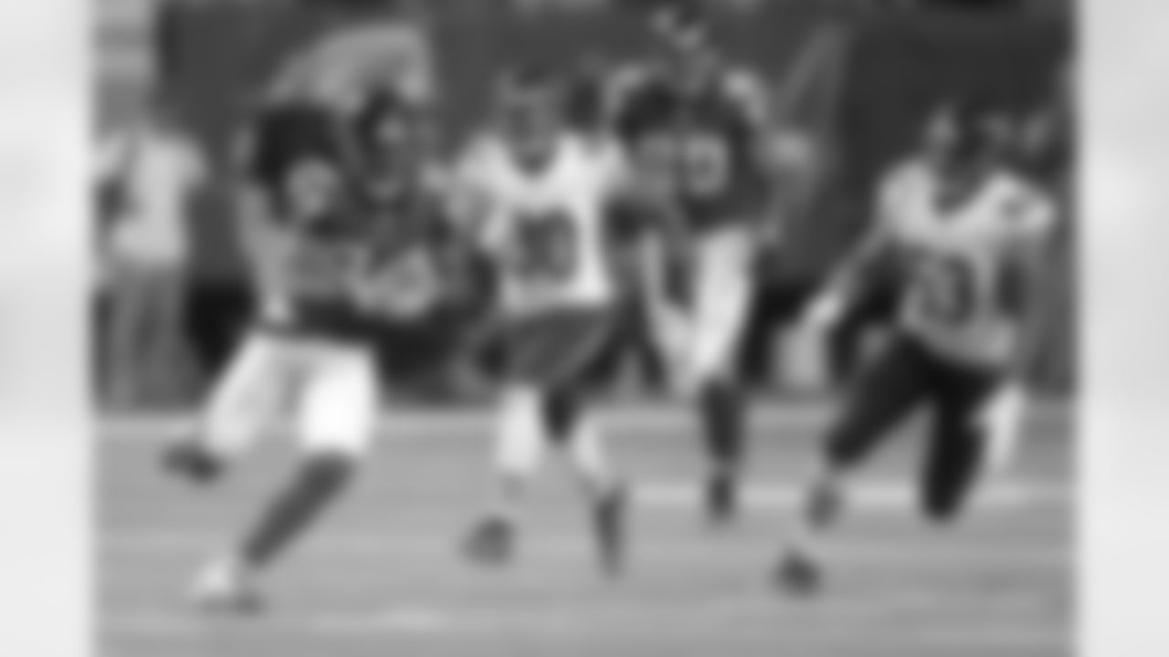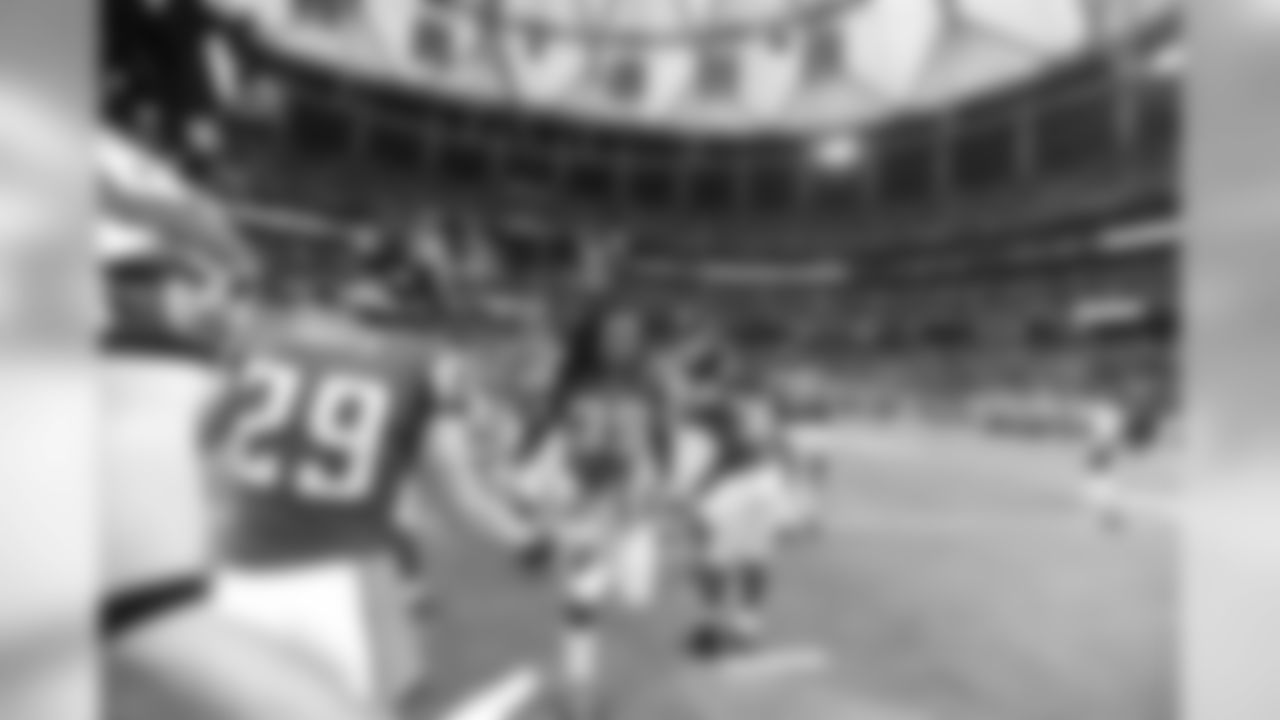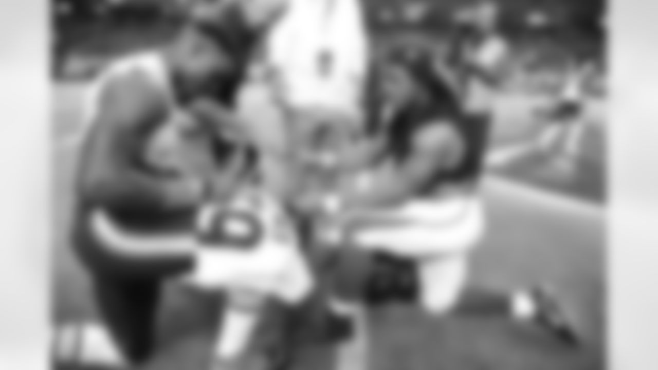 RB Devonta Freeman exchanges jerseys with Bears LB Christian Jones, who also played for Florida State University