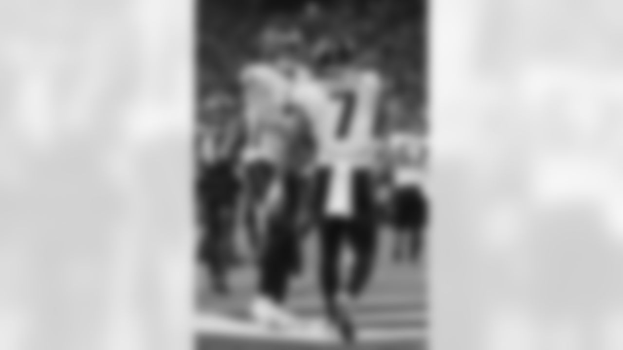 Atlanta Falcons running back Bijan Robinson #7 celebrates with wide receiver Darnell Mooney #1 after a touchdown during the third quarter of the Week 14 Game against the Minnesota Vikings at U.S Bank Stadium in Minneapolis, Minnesota on Sunday, December 8, 2024. (Photo by Brad Rempel/Atlanta Falcons)