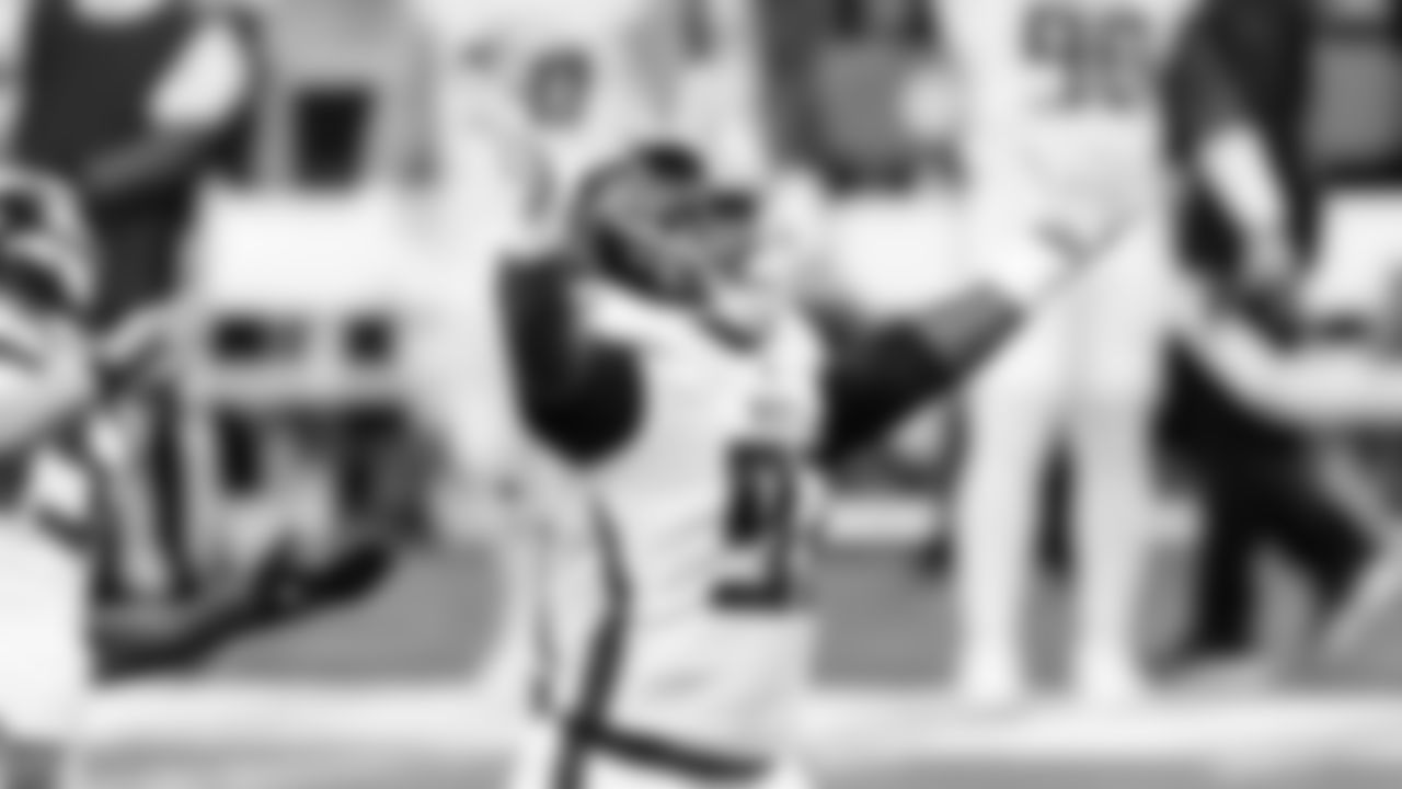 Atlanta Falcons defensive tackle Grady Jarrett #97 celebrates after New Orleans Saints quarterback Taysom Hill #7 is sacked during the first quarter the game against the New Orleans Saints on November 22, 2020.
