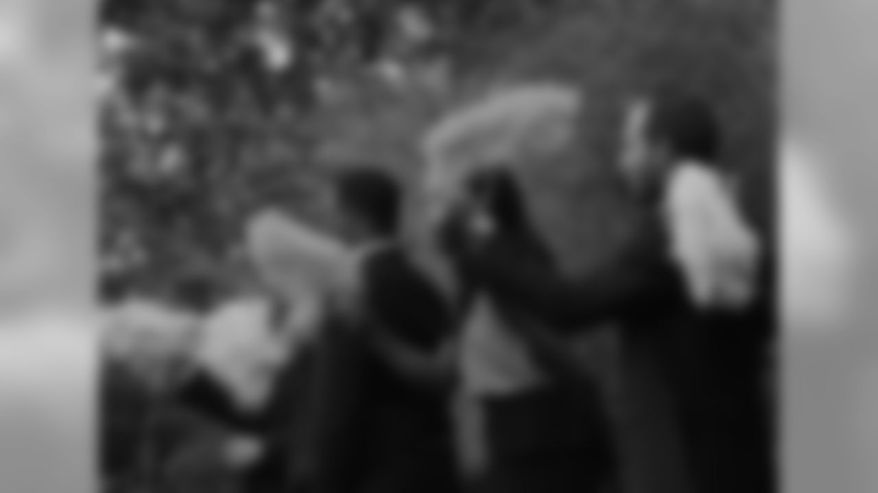 DT Corey Peters and P Matt Bosher along with others cheer as the breast cancer survivors arrive.