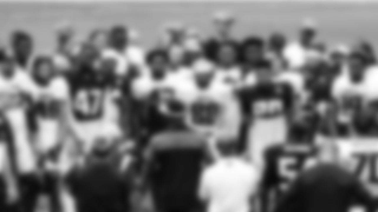 Former Falcons quarterback Michael Vick talks to the players during AT&T Atlanta Falcons Training Camp at Atlanta Falcons Headquarters in Flowery Branch, Georgia, on Monday, August 10, 2022. (Photo by Mitch Martin/Atlanta Falcons)
