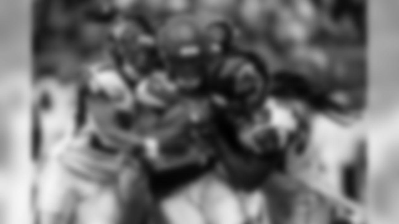Atlanta Falcons defensive end Adrian Clayborn #99 and cornerback Desmond Trufant #21 in action against Indianapolis Colts running back Nyheim Hines #21 during the game at Lucas Oil Stadium in Indianapolis, Indiana, on Sunday September 22, 2019. (Photo by Kara Durrette/Atlanta Falcons)