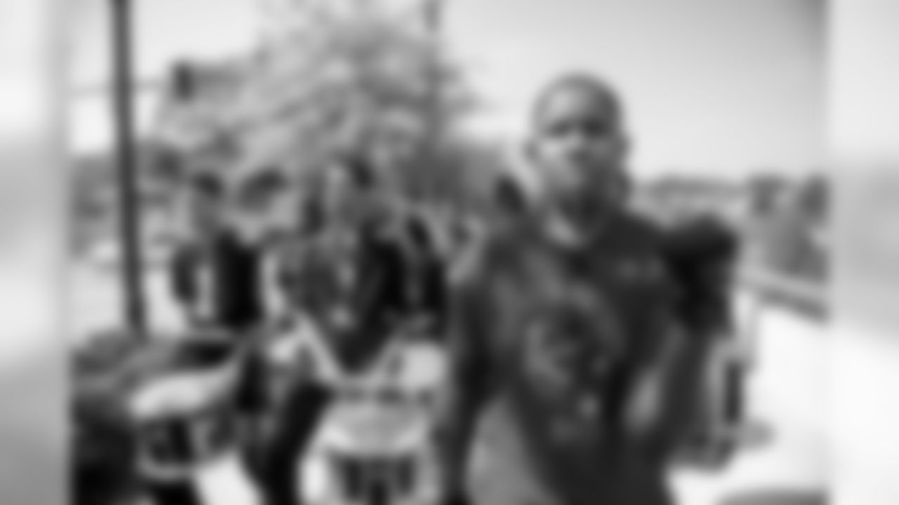 Members of the Big Gang gestures before the game between the Atlanta Falcons and the Tennessee Titans at Mercedes-Benz Stadium in Atlanta, Georgia, on Sunday September 29, 2019. (Photo by AJ Reynolds/Atlanta Falcons)
