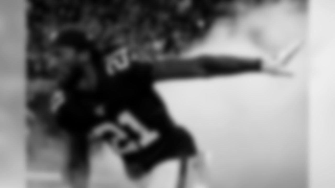 Atlanta Falcons cornerback Desmond Trufant #21 runs out of the tunnel at Mercedes-Benz Stadium in Atlanta, Georgia, on Sunday September 29, 2019. (Photo by Kara Durrette/Atlanta Falcons).