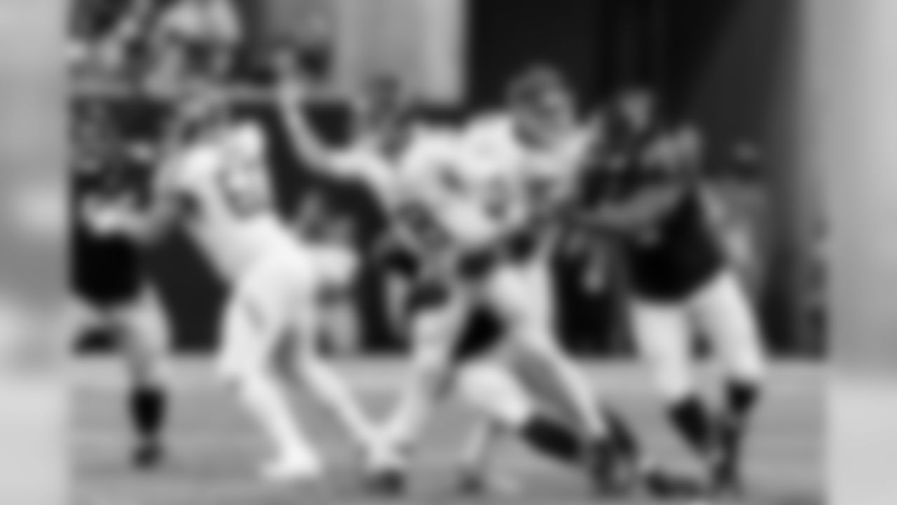 Atlanta Falcons defensive end John Cominsky #50 reaches for the ball during the game between the Atlanta Falcons and the Los Angeles Rams at Mercedes-Benz Stadium in Atlanta, GA, on Sunday October 20, 2019. (Photo by Kara Durrette/Atlanta Falcons)