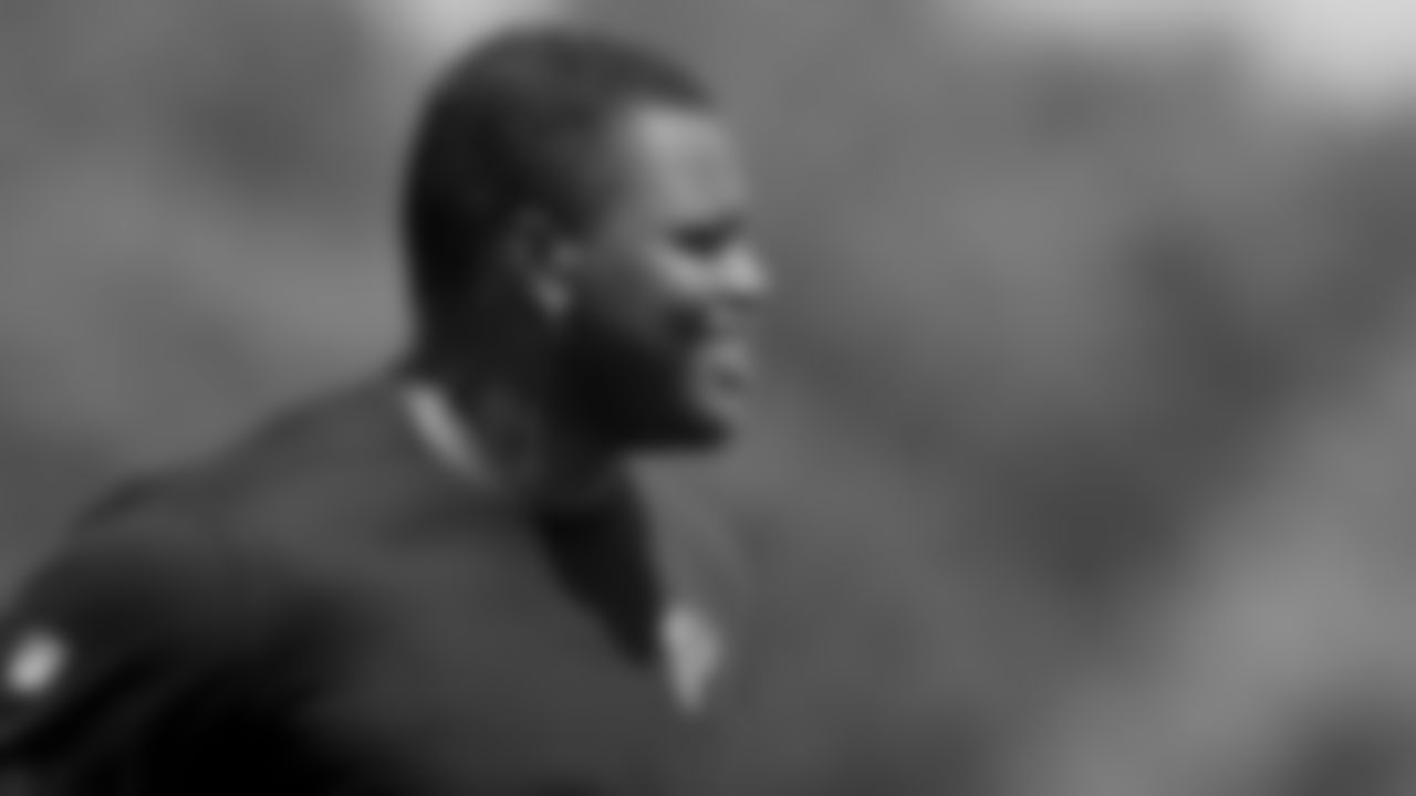 Atlanta Falcons defensive tackle Grady Jarrett #97 laughs at AT&T Atlanta Falcons Training camp on August 9, 2020 in Flowery Branch, Ga. (Photo by Kara Durrette/Atlanta Falcons)