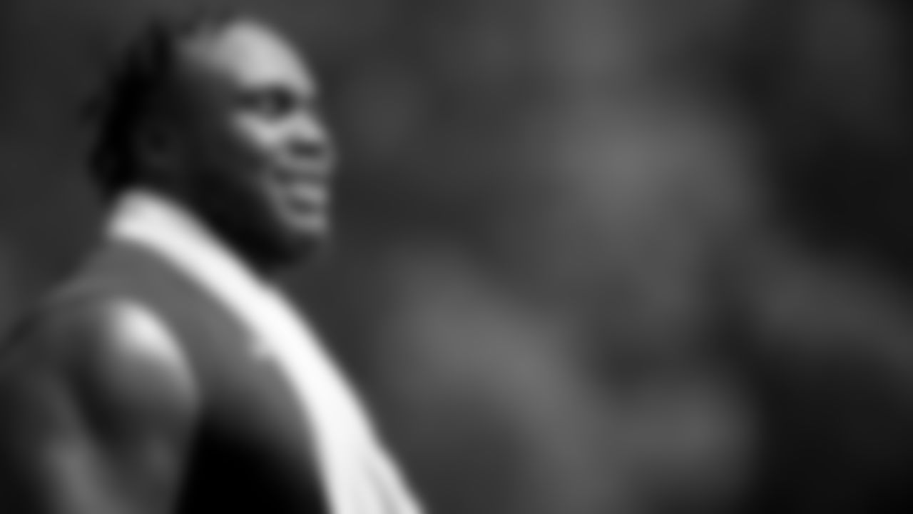 Atlanta Falcons defensive tackle Grady Jarrett #97 smiles at AT&T Atlanta Falcons Training camp on August 9, 2020 in Flowery Branch, Ga. (Photo by Kara Durrette/Atlanta Falcons)