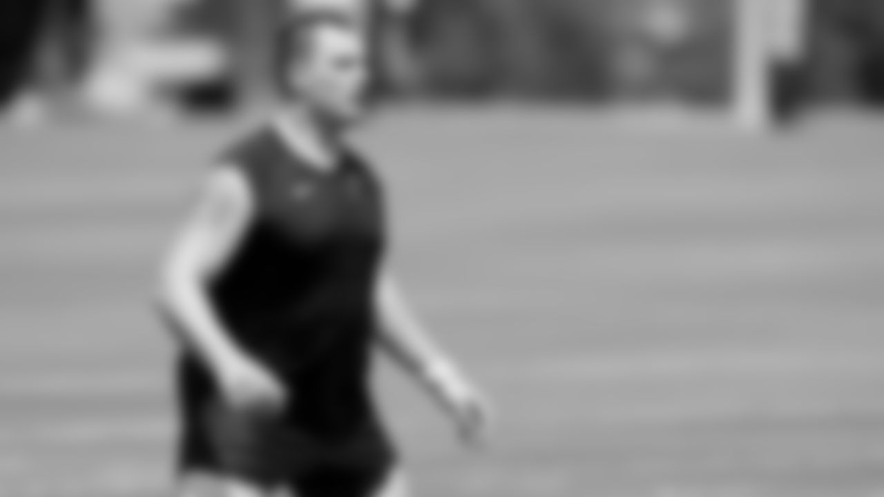 Atlanta Falcons center Alex Mack #51 warms up at AT&T Atlanta Falcons Training camp on August 9, 2020 in Flowery Branch, Ga. (Photo by Kara Durrette/Atlanta Falcons)