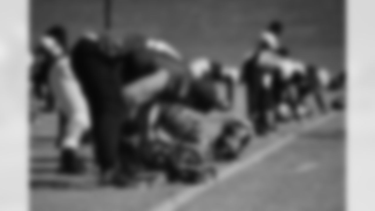 The d-line comes together before practice