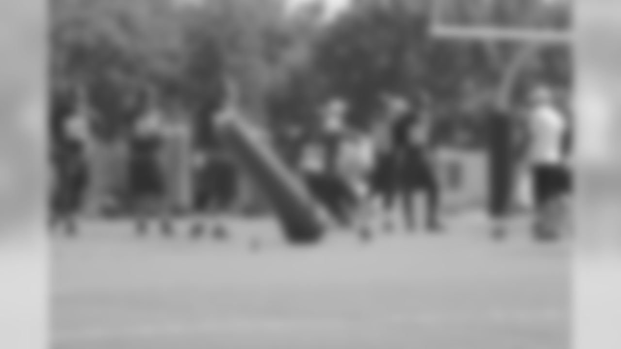 Thomas DeCoud slaps a pass away from William Moore during a drill
