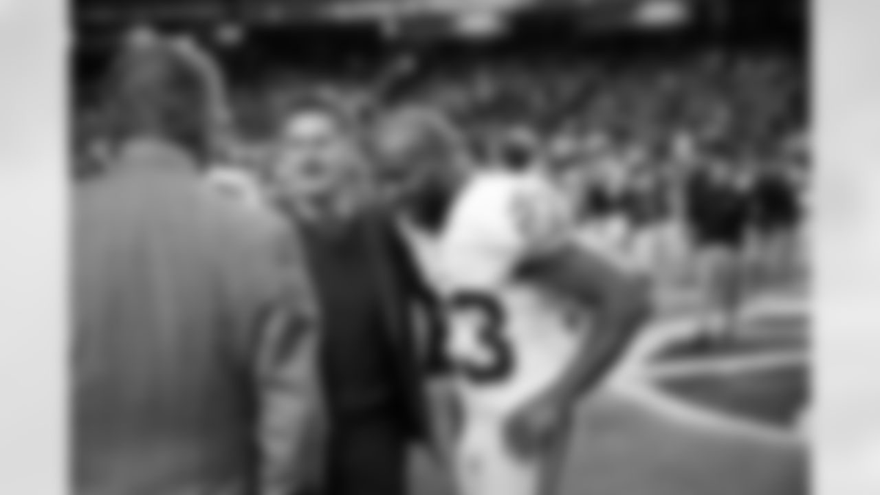 Former Falcon DeAngelo Hall greets GM Thomas Dimitroff and owner Arthur Blank