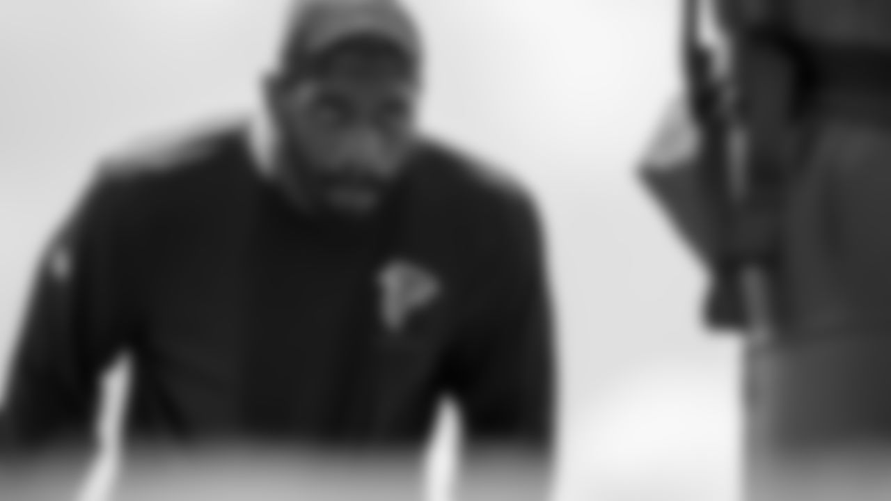 Atlanta Falcons defensive end Takk McKinley #98 looks on at AT&T Atlanta Falcons Training Camp on August 4, 2020 in Flowery Branch, Ga. (Photo by Rob Foldy/Atlanta Falcons)
