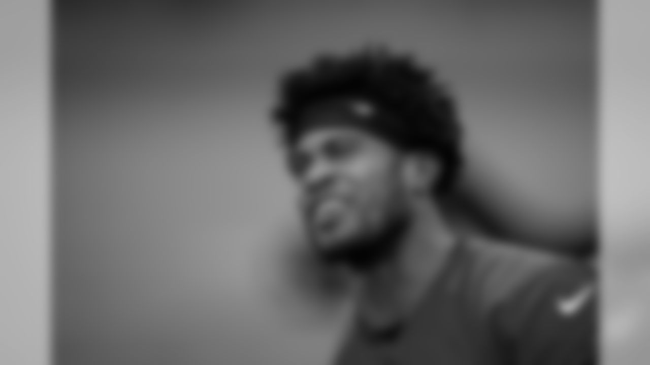 Atlanta Falcons defensive end Allen Bailey #93 hypes up the team during practice. (Photo by Kara Durrette/Atlanta Falcons).