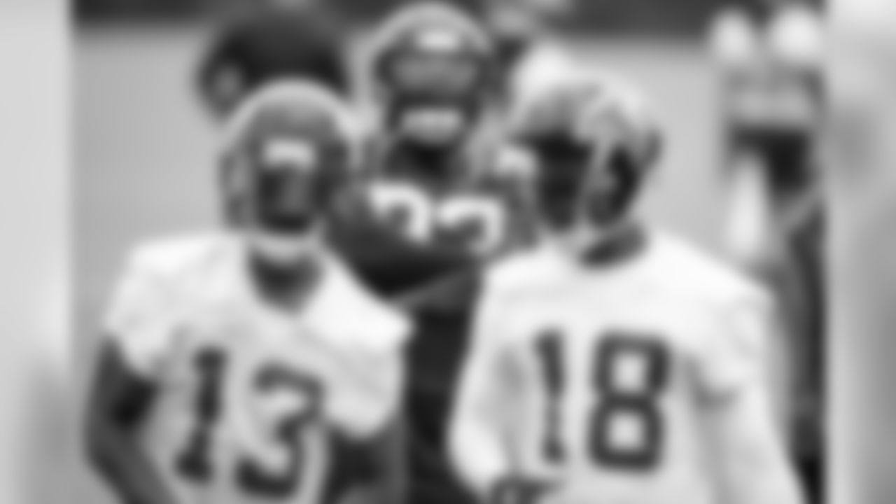 Atlanta Falcons defensive end Allen Bailey #93 photo bombs a photo of wide receiver Christian Blake #13 and wide receiver Calvin Ridley #18 during practice. (Photo by Kara Durrette/Atlanta Falcons).