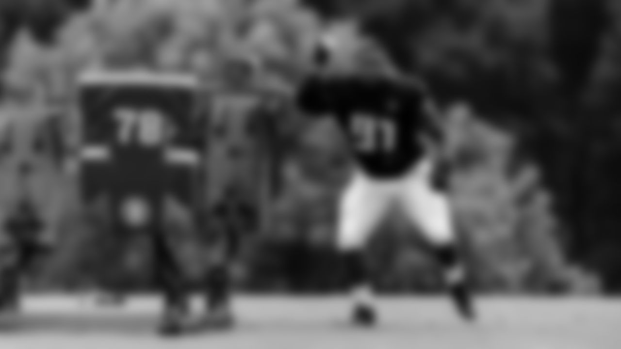 Atlanta Falcons linebacker Lorenzo Carter #9 during AT&T Atlanta Falcons Training Camp at Atlanta Falcons Headquarters in Flowery Branch, Georgia, on Monday, August 1, 2022. (Photo by Mitch Martin/Atlanta Falcons)