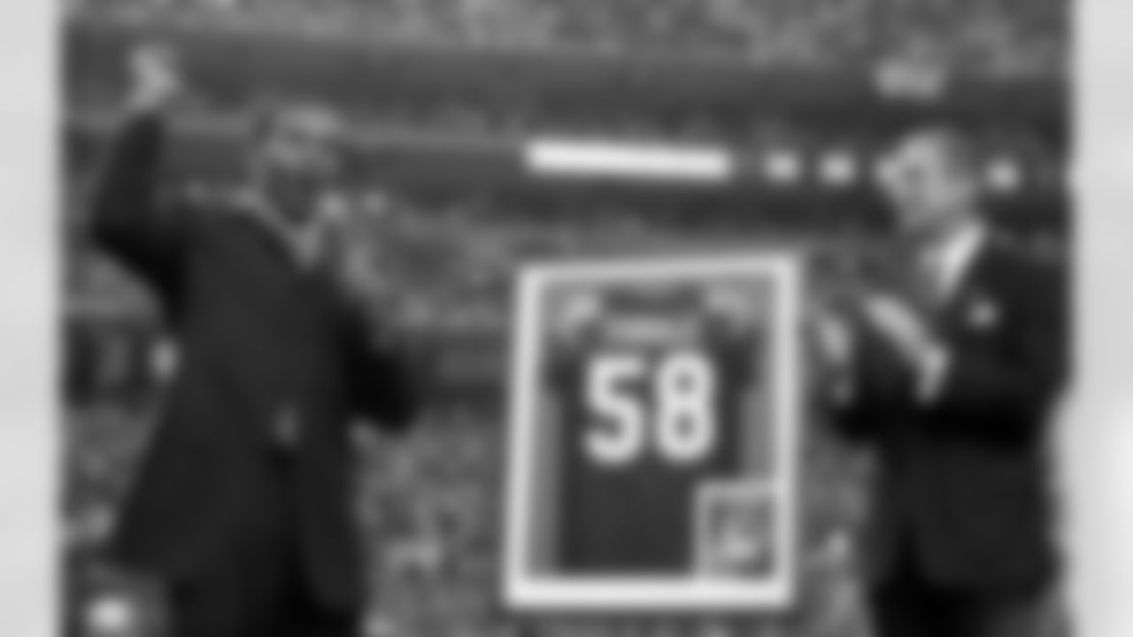 Jesse Tuggle speaks to the crowd as Atlanta Falcons owner Arthur Blank applauds during halftime ceremonies where Tuggle's jersey was retired at the Georgia Dome in Atlanta Sunday, Dec. 22, 2002. Tuggle played his entire football career with the Falcons and was the all time leader in tackles for the team with 2065. (AP Photo/Gregory Smith)