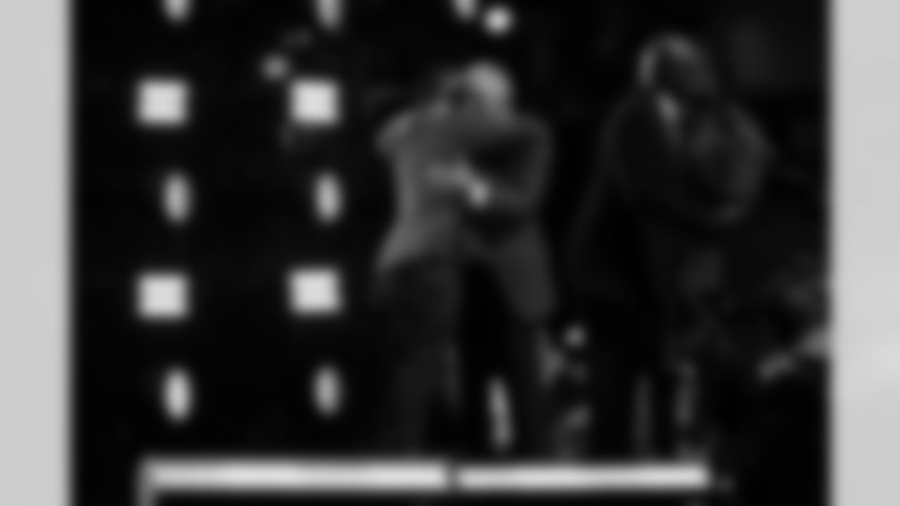 Atlanta Falcons Owner Arthur M Blank looks on as Atlanta Falcons Legend Roddy White speaks to fans to fans after receiving the Atlanta Falcons Legend jacket by Atlanta Falcons President Rich McKay during the Ring-of-Honor Ceremony at halftime during the game between the Atlanta Falcons and the Carolina Panthers at Mercedes-Benz Stadium in Atlanta, GA, on Sunday December 8, 2019. (Photo by Kyle Hess/Atlanta Falcons)