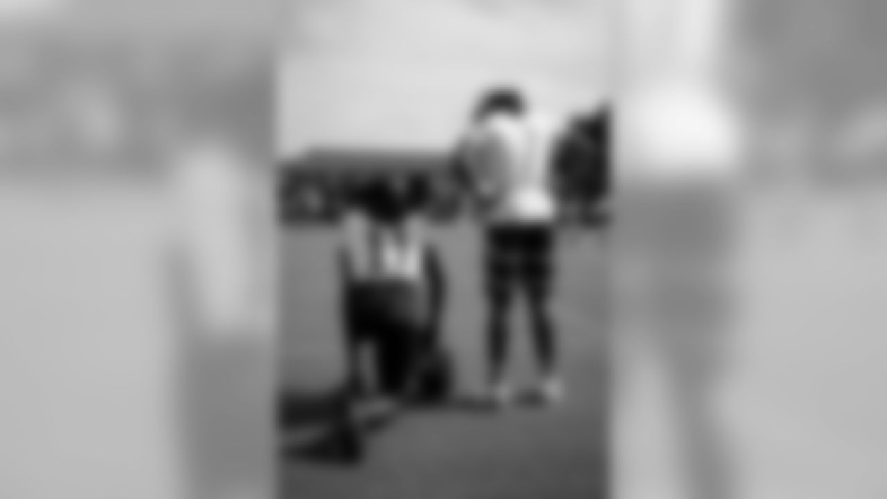 Falcons legend Roddy White and Atlanta Falcons wide receiver Mohamed Sanu #12 on the last day of 2019 AT&T Atlanta Falcons Training Camp. (Photo by Kara Durrette/Atlanta Falcons)