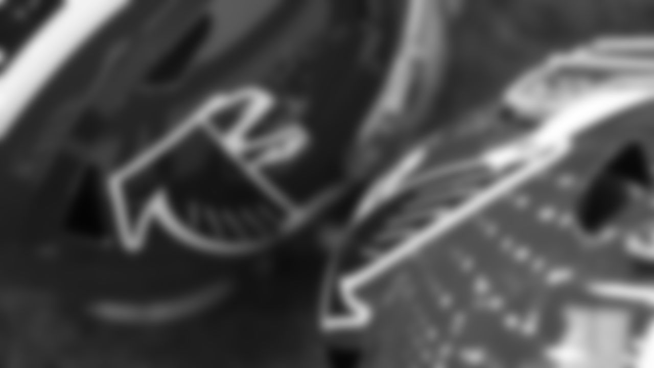 Detail view of gloves on a red helmet during practice in Flowery Branch, Georgia, on Wednesday, October 12, 2022. (Photo by Shanna Lockwood/Atlanta Falcons)