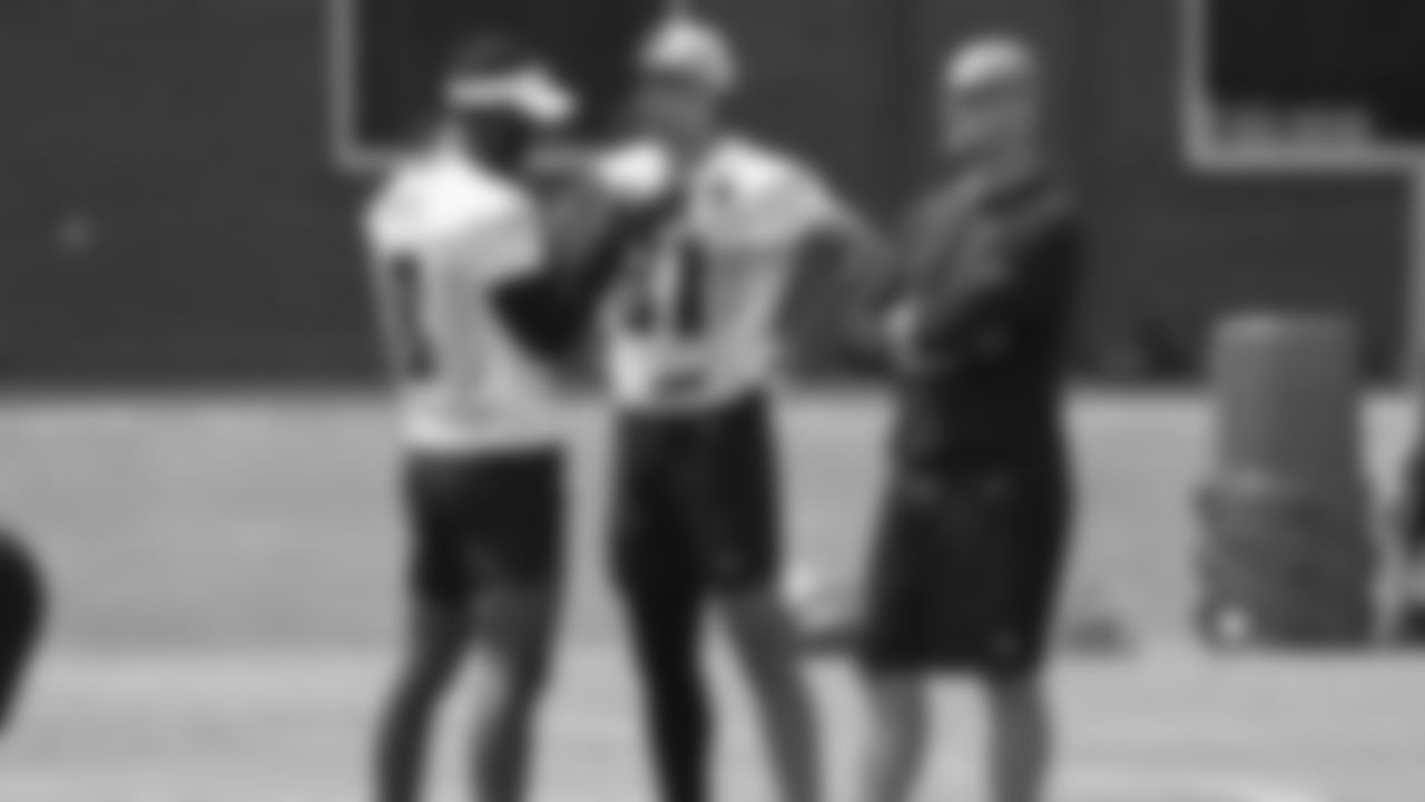 Atlanta Falcons tight end Kyle Pitts #8 talks to tight end Brayden Lenius #81 during team practice at Atlanta Falcons Headquarters in Flowery Branch, Georgia, on Thursday, May 19, 2022. (Photo by Shanna Lockwood/Atlanta Falcons)