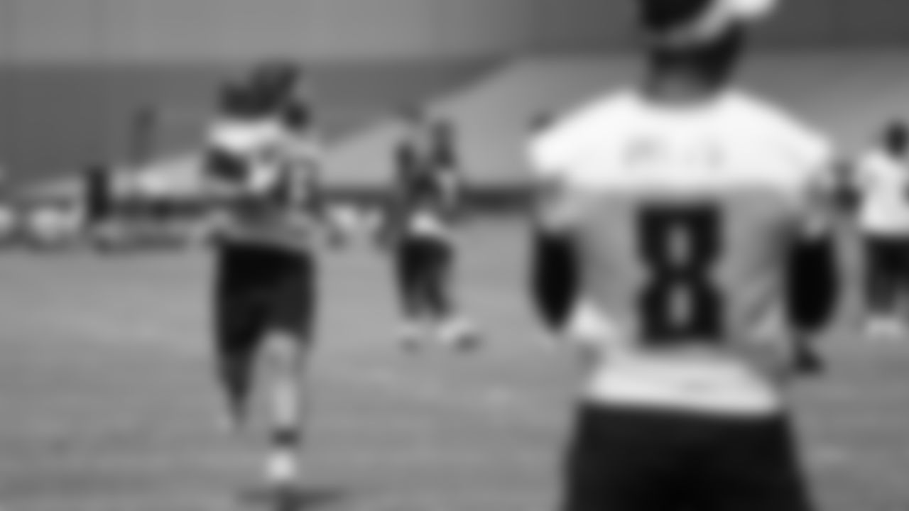 Atlanta Falcons tight end Kyle Pitts #8 during team practice at Atlanta Falcons Headquarters in Flowery Branch, Georgia, on Thursday, May 19, 2022. (Photo by Shanna Lockwood/Atlanta Falcons)
