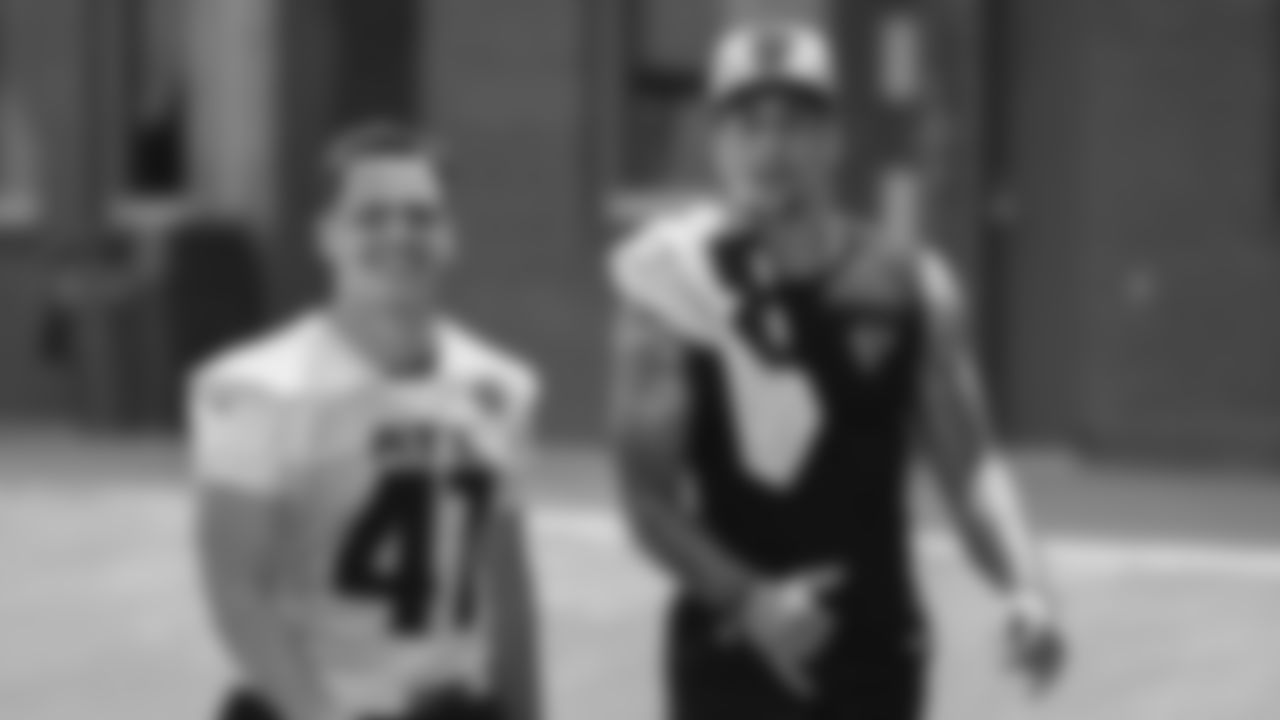 Atlanta Falcons tight end John Raine #41 and tight end Brayden Lenius #81 during team practice at Atlanta Falcons Headquarters in Flowery Branch, Georgia, on Thursday, May 19, 2022. (Photo by Shanna Lockwood/Atlanta Falcons)