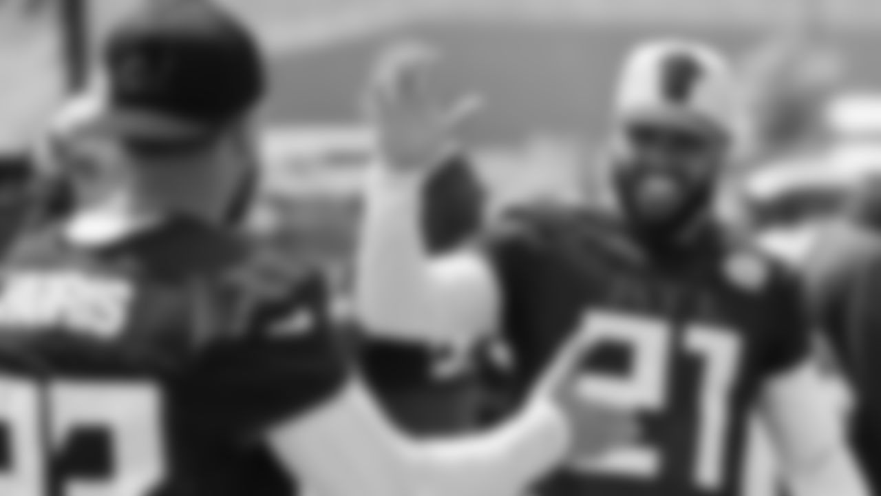 Atlanta Falcons free safety Dean Marlowe #21 greets safety Erik Harris #23 during team practice at Atlanta Falcons Headquarters in Flowery Branch, Georgia, on Thursday, May 19, 2022. (Photo by Shanna Lockwood/Atlanta Falcons)